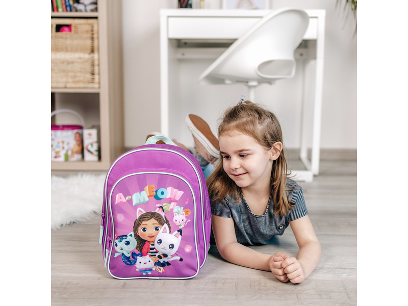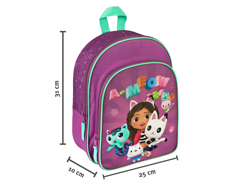 Akár óvodába, akár kirándulásra pakol gyermekének, a gyermek hátizsák Gabi babaháza motívummal biztosan nem hiányozhat az új kalandoknál. A hátizsák elülső zsebbel és allítható magasságú pántokkal rendelkezik. A táska méretei: 31 x 25 x 10 cm.