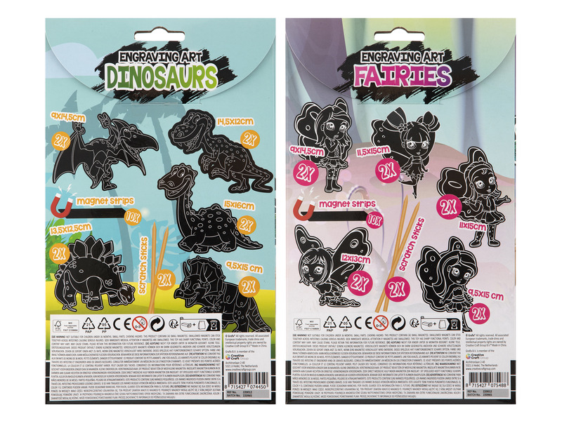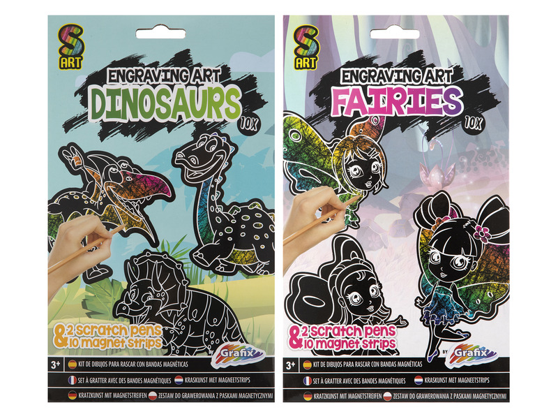 Grafix - Képkarcoló mágnesek 10 db 2 féle (Tündér /Dinó) változatban. Kérjük hogy a megjegyzésbe tüntesse fel, hogy melyik változatot kéri. Készíts hűtőmágnest karckép technika segítségével! Ezzel a készlettel 10 db tündéres figurát vagy dinós figurát tudsz megkarcolni. Ragaszd a képek hátoldalára a csomagban található mágnes csíkot és helyezd el munkáidat a hűtőn vagy egyéb fémes felületeken. A csomag összesen 5x2 db karckép figurát, 10 db felragasztható mágnes csíkot, valamint 2 karcoló eszközt tartalmaz.
