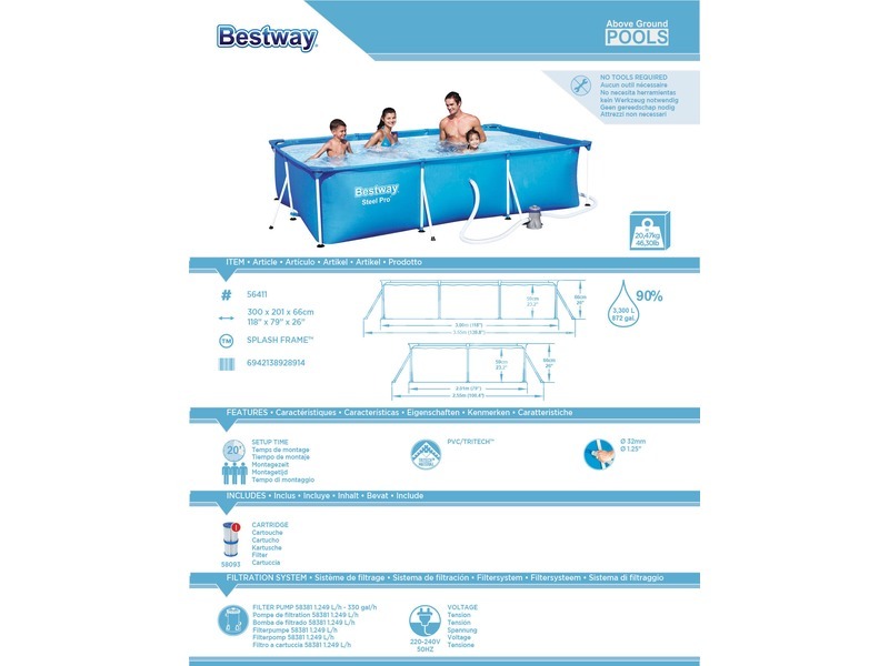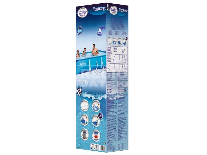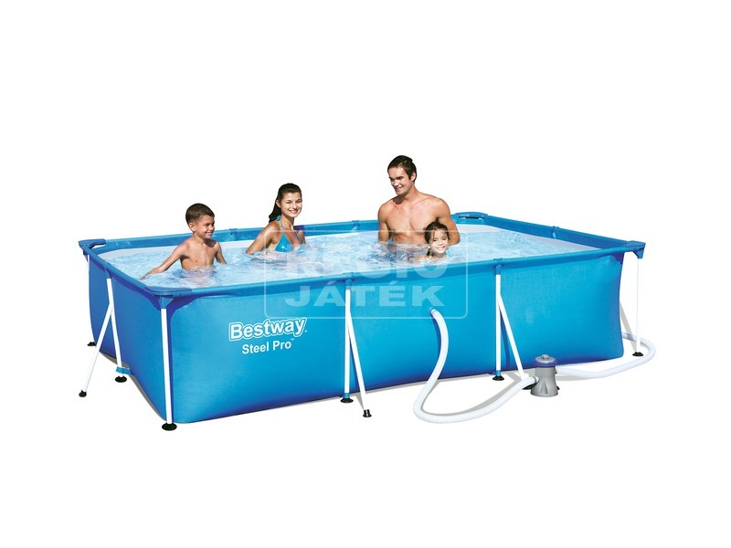Csobbanjatok a forró napokon a szögletes medencébe! Az Amalfi fémvázas medence egy vastag, erős fémszállal átszőtt PVC-ből készült téglalap alakú medence. A medencében az egész család kényelmesen elfér, a medencét erős acélvázzal lehet felállítani, és már lehet is tölteni vízzel. A készlethez egy vízforgató is tartozik, ami óránként 1249 liter vizet képes szűrni és tisztítani. A vízforgató 220 V-os hálózati áramról működik, feküdjetek be a medencébe, és élvezzétek a hűvös vizet a legnagyobb kánikulában is! Az Amalfi fémvázas medence felállított méretei: 300 x 201 x 66 cm. Vízkapacitás: 3300 liter.