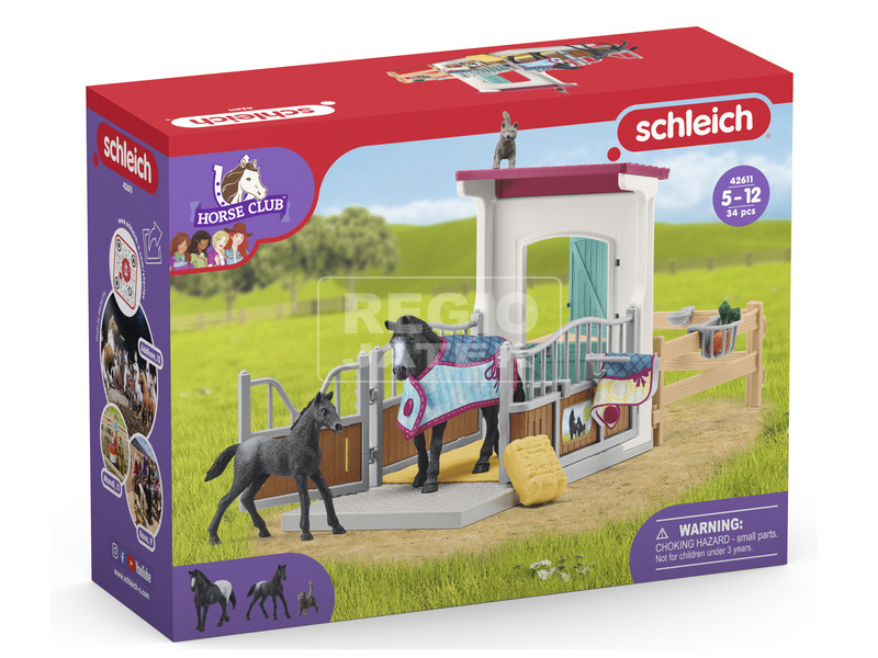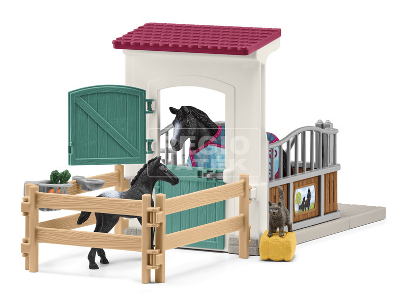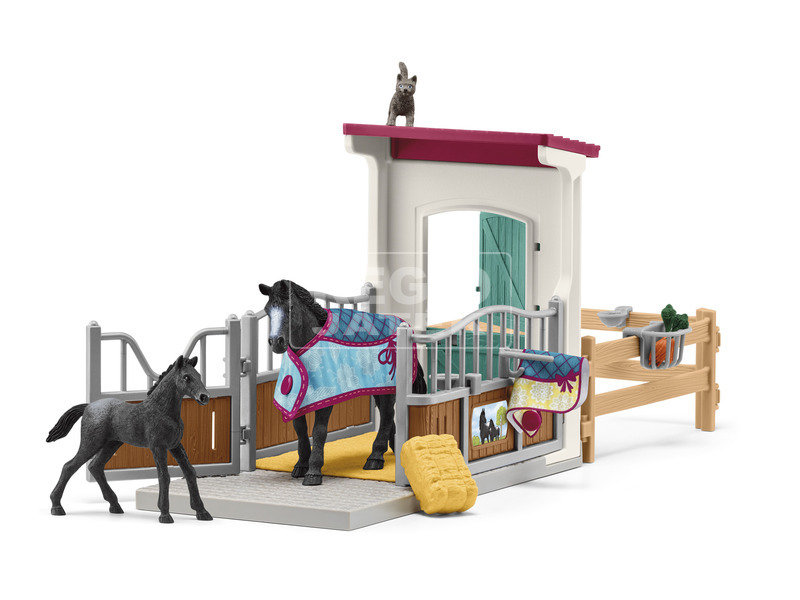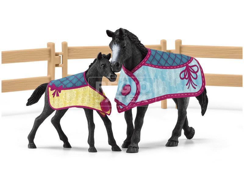 Nem csoda, hogy az Appaloosa kanca és csikója olyan jól érzi magát a dobozban. Olyan hangulatos itt, és minden megvan, amire a szívük vágyik. A takarmány a szénatartóban van, a lovak puha takarói pedig már készen is vannak, így már csak a nyereg alá kell rakni őket. Amíg a kanca és a csikó vizet isznak az itató lyukból, a macska társaságban tartja őket. Kényelembe helyezte magát egy szalmabálán. Egy sárgarépa, amit csak egy ló tud rágcsálni, de nem mutat érdeklődést. Talán mindketten elmennek a karámba, hogy együtt szórakozzanak. A készlet része: 1 x Appaloosa kanca, 1 x Appaloosa csikó, 1 x macska, 1 x lóbox, 1 x lovasszekrény, 1 x karám kerítéssel, 1 x szalmabála, 1 x csomó sárgarépa, 2 x lótakaró, 1 x nyeregtartó Méretei: 24,5 × 19 × 8,2 cm