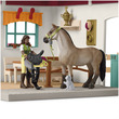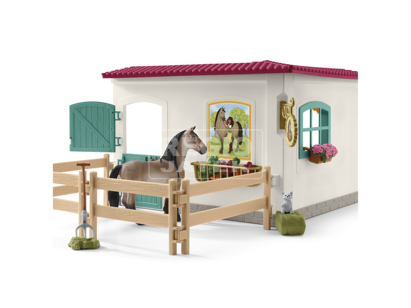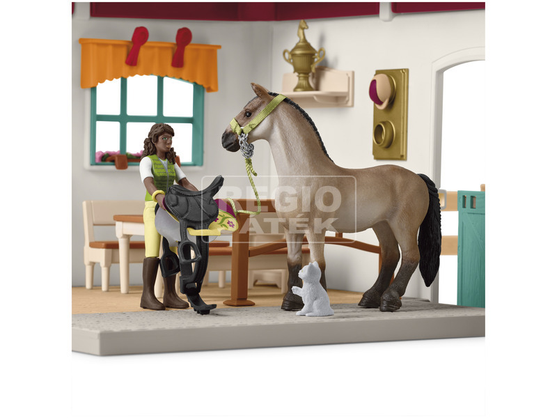 A Schleich Nyeregszoba istálló tökéletesen felszerelt: a kefék és a fésűk már várnak, hogy lovad szőrét ragyogóvá varázsolhasd. A gyűjteményhez tartozik nyereghez illő takaró és természetesen hozzá illő kantár is. Ha elfáradtál a lógondozásban, ülj le kényelmesen az asztalhoz és fogyassz el egy csésze finom kávét vagy teát, egy szelet almáspitével!