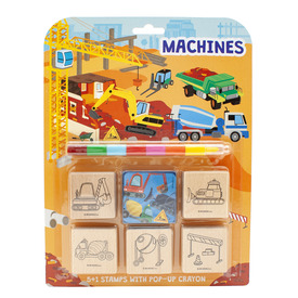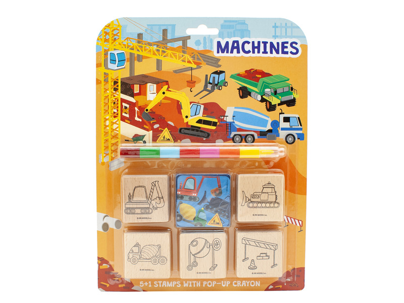 Nagyszerű szórakozás a bélyegekkel-munkagépek motívumokkal! A bélyegzős tevékenységnek köszönhetően a gyerekek nemcsak képzelőerejüket és kreativitásukat, hanem finommotorikáját is fejlesztik. A csomag 5db könnyen megfogható fanyomdát és egy színes nyomdapárnát tartalmaz kedvenc motívummal. A nyomda mérete: 4,5x4,5 cm.