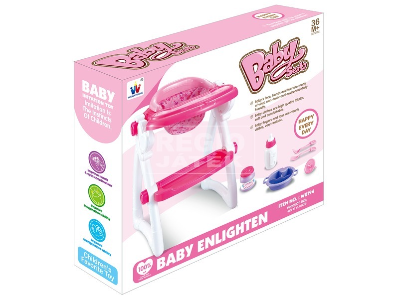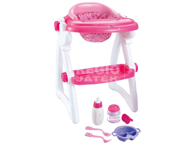 Ültesd be a játékbabát a székbe, hogy kényelmesen meg tudjon ebédelni! A Baba etetőszék egy műanyag vázas, fehér és rózsaszín fotel, lábtartóval és tálcával. Az etetőszékbe be tudod ültetni kedvenc játékbabádat, és meg tudod etetni, az ennivaló nem fog kárba vészni, hiszen a baba előtt lévő tálca minden lepotyogó falatot megfog. A készlet cumisüveget, bébiételes flakont, tányért és baba evőeszközöket is tartalmaz, a játék együtt használható a legtöbb 30-40 cm-es játékbabával is. A Baba etetőszék összerakott méretei: 37 x 31 x 49 cm.