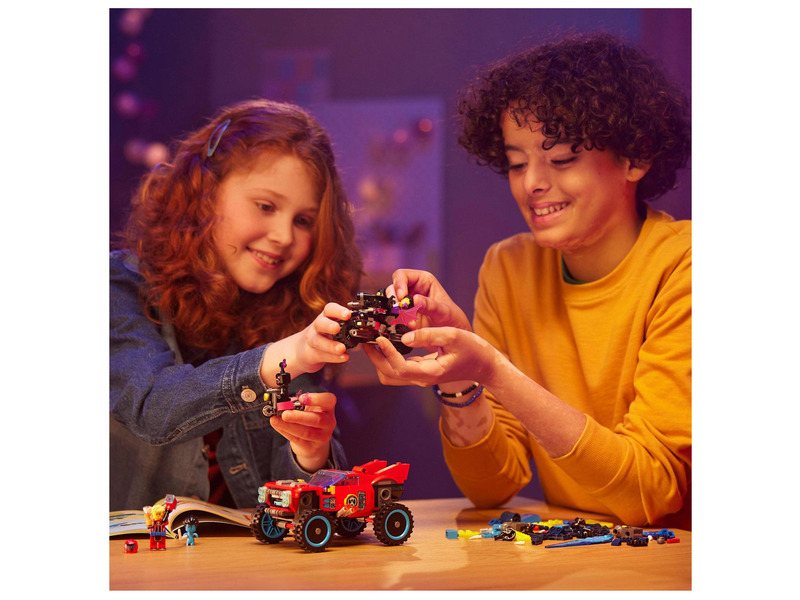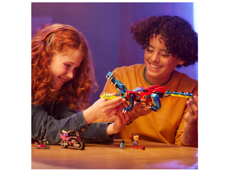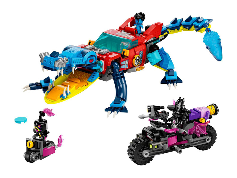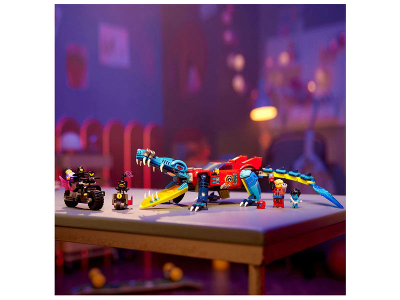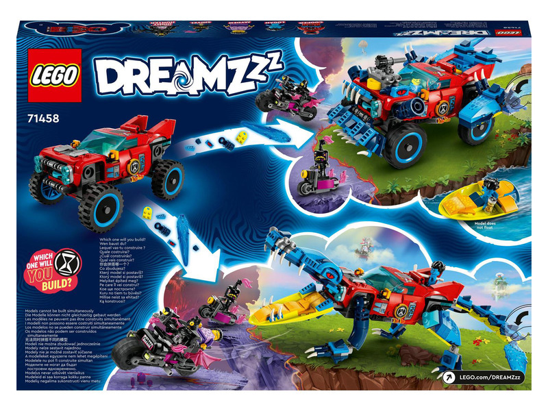 A 8+ éves gyermekek teljes gázzal száguldhatnak az Álomvilágba a LEGO® DREAMZzz™ Krokodil autó (71458) építőjátékszettel. Mint a sorozatban, a gyerekek megépíthetnek egy csúcsszuper autót, amely segít megmenteni Jaydent az Éjvadásztól! 1 szett, 2 építési lehetőség. A játékszett 2 építési lehetőséget és rengeteg történetvezérelt építési útmutatót tartalmaz, amely arra biztatja a gyerekeket, hogy válasszanak saját kalandot és élvezzék ki, hogy megduplázódik a játékidő. Eldönthetik, hogy egy krokodil autót építenek, amellyel legyőzhetik a rémálmokat, vagy egy szupergyors terepjárót és egy mini csónakot raknak össze, hogy üldözőbe vehessék őket. Krokodilmódban a jármű karjai és lábai mozgathatók, az elülső rácsoknál pedig egy korongvető van elrejtve, így a gyerekek a krokodil szájából lőhetik a korongokat. Autómódban a járműnek forgó kereke és levehető teteje van, hogy bele lehessen ültetni egy minifigurát. Fantasztikus minifigurák Az építőjátékszett részletgazdag minifigurákat tartalmaz: Cooper, Jayden és az Éjvadász, akinek menő játékmotorja és egy gonosz segítője van.