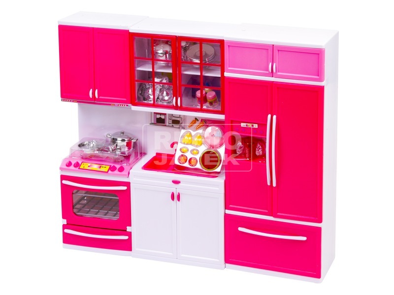 Főzz meg minden alapanyagot a rózsaszín kiskonyhában! Az Elemes mini konyha hűtőszekrénnyel egy komplett konyhai bútorkészlet működő tűzhellyel, elszívóval, mosogatóval és egy hatalmas hűtőszekrénnyel felszerelve. A sütő ajtaja és a szekrények ajtajai nyithatók, a mosogató csapját el lehet forgatni, a hűtő jégkockákat is tud készíteni. Nyomd meg a tűzhely gombját, a főzőlap és a sütő belseje is világítani kezd, miközben a játék hangokat ad ki magából. Az Elemes mini konyha hűtőszekrénnyel játékbabákkal is együtt használható. A készlet méretei: 38 x 8 x 34 cm.