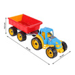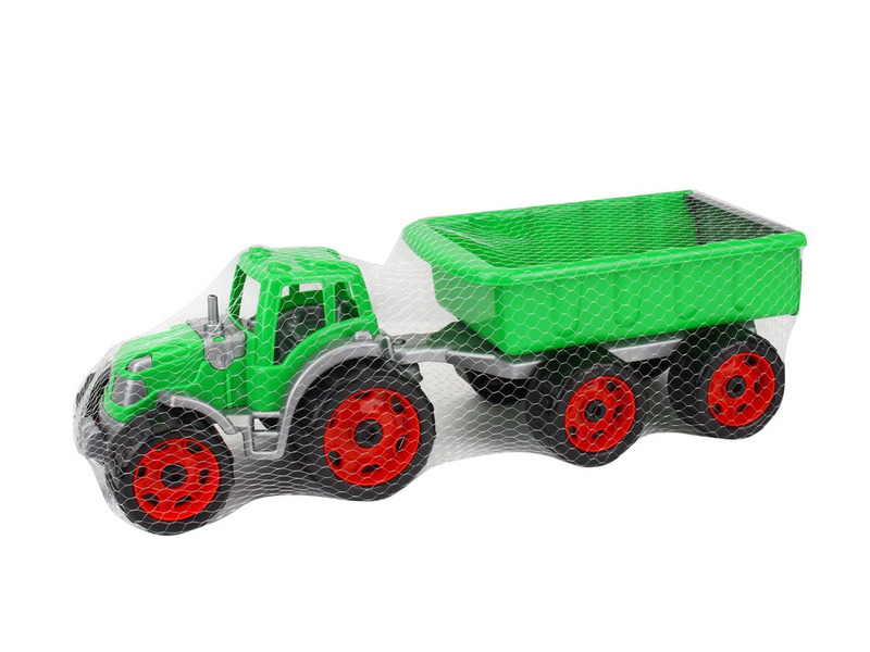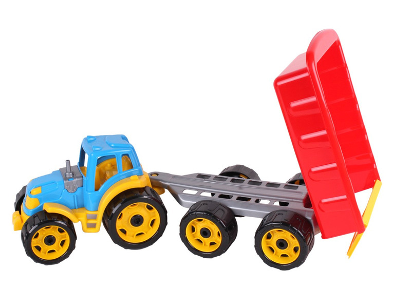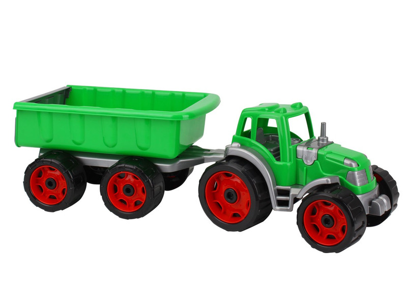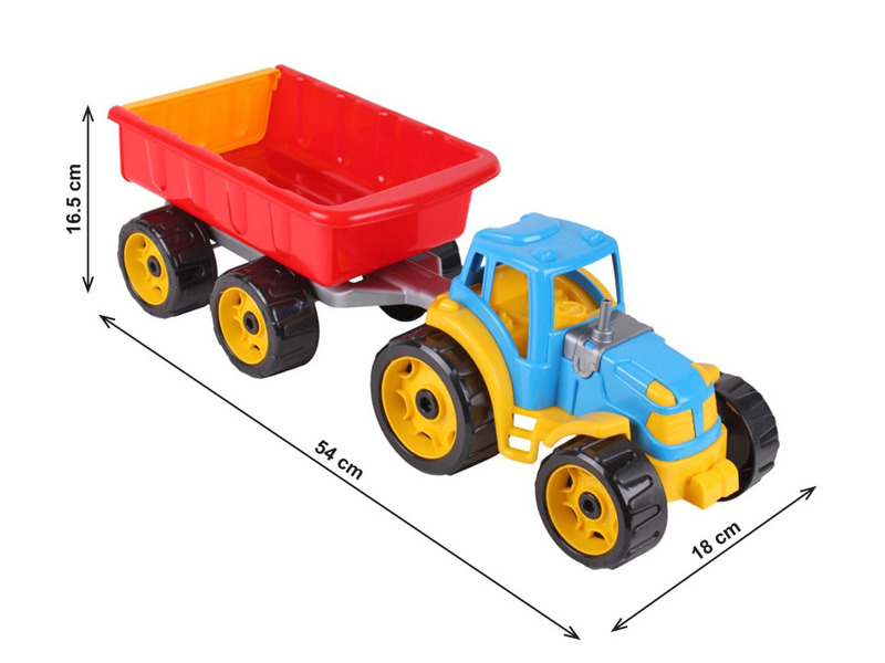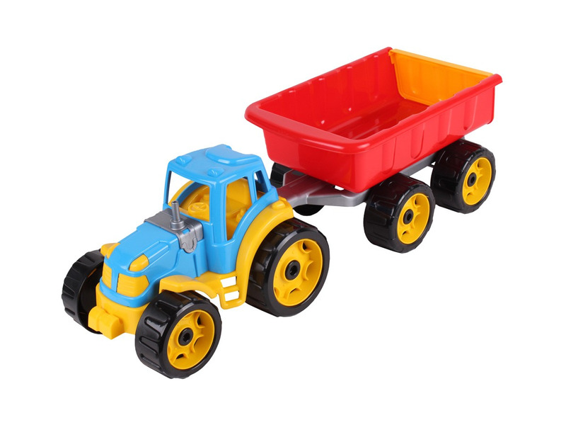 Szállítsd játékaidat egy erős műanyag traktorral! A Műanyag traktor utánfutóval egy erős felépítésű színes traktor, akasztható pótkocsival. A traktor és utánfutó is fémtengelyeken nyugszik, a nagyobb kerekek bármilyen nehéz vagy süppedős tereppel is könnyen megküzdenek. A traktorral szállíthatsz homokot, sódert, vagy akár plüssfigurát is utaztathatsz benne!