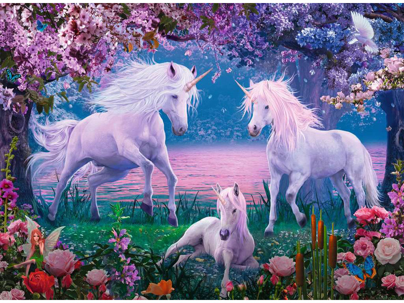 Képzeld el, hogy sétálsz, és a legvarázslatosabb jelenetben botorkálsz. Három fiatal egyszarvú táncol játékosan a naplemente lenyűgöző ragyogásában, madarak és pillangók lebegnek, élvezve a gyönyörű virágzó fákat a buja tó mellett.