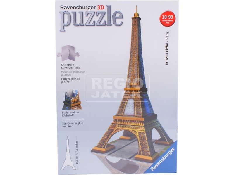 Párizs leghíresebb épülete, az Eiffel-torony puzzle darabokból! Az Eiffel-torony 224 darabos 3D puzzle az 1889-ben megépült épületet ábrázolja, méretarányos kiadásban A mozaikdarabok erősen kapcsolódnak egymáshoz, ragasztó nélkül össze tudod állítani az épületet. Az Eiffel-torony 216 darabos 3D puzzle magassága: 44 cm.
