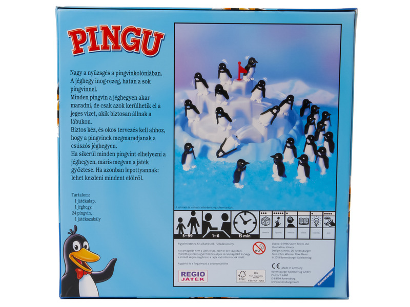 Kinek a pingvinje fog felérni a jéghegy csúcsára? A Pingu társasjátékban pingvinek versenyeznek egymással, hogy ki tudja gyorsabban megmászni a jéghegyet. A feladat könnyűnek tűnik, de elég egy rossz mozdulat, és az összes pingvin is lecsúszhat! Minden játékos több pingvinnel vág neki a veszélyes és meredek útnak, a Pingu társasjátékot az nyeri, aki elsőként juttatja fel az összes madarat a jéghegy tetejére. A doboz tartalma: 1 darab jéghegy játéktábla, 24 darab pingvin figura, játékszabály.