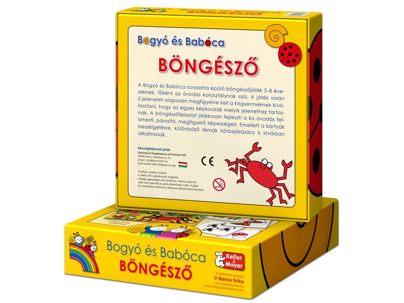 A Bogyó és Babóca társasjáték már 3 éves kortól nagyszerű játékélményt nyújt a kisgyere-keknek is, a népszerű mesefigurák miatt pedig a család kedvence lesz ez a játék. A doboz 5 darab játéklapot tartalmaz, melyek mindegyikén 1-1 jelenet látható. A kicsik feladata lesz ezeknek a lapoknak a megfigyelése és a kártyákat a rajtuk található képek alapján a megfelelő jelenthez illesztése. A játék a böngészésnek köszönhetően fejleszti a felismerő, megfigyelő és párosító képességeit. A játékban található kártyák alkalmasak az aktuális téma megbeszélésére.