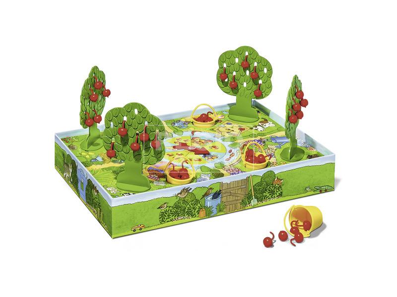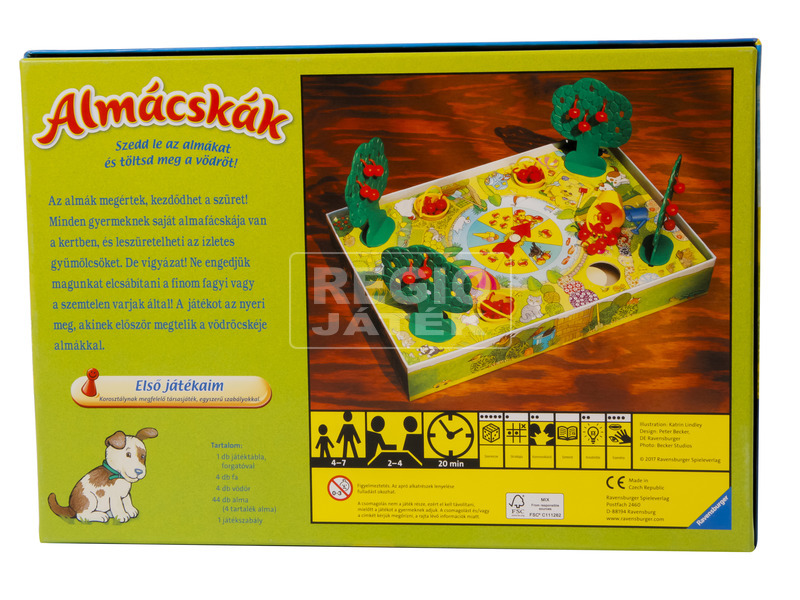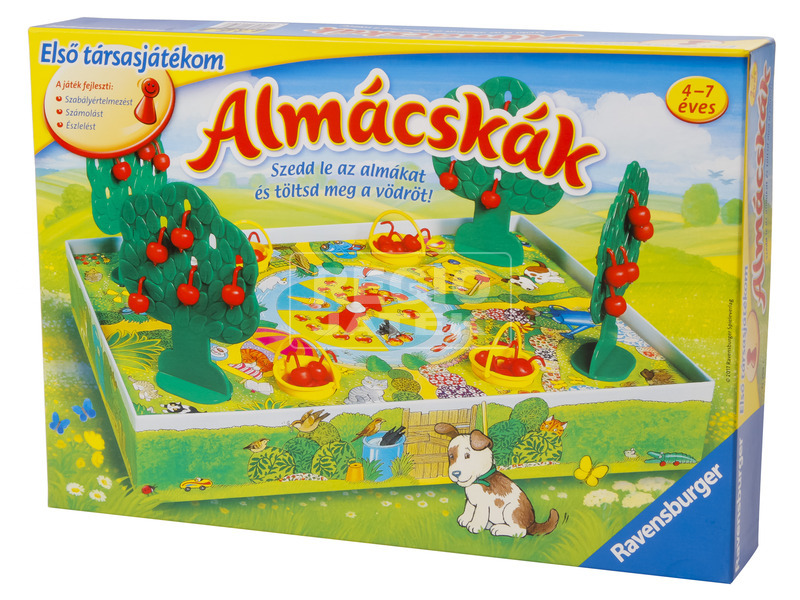 Szedd le az almákat és töltsd meg a vödröt! A Ravensburger Almácskák társasjáték egy óvo-dásoknak készült vidám társasjáték, amivel a számolást és az észlelést lehet fejleszteni. A játékosok a pörgettyűt megforgatják, és ahol megáll a mutató, annyi almát szedhetnek le a fáról. Miközben gyűjtik a kosarakba a finom gyümölcsöt, megismerkednek a gyerekek a szá-mokkal, és még az összeadást is gyakorolhatják! Aki a legtöbb almát szedi le, megnyeri az Almácskák társasjátékot!