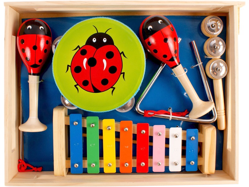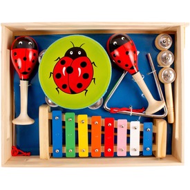 Játsszátok el kedvenc zenéiteket fa hangszereken! Ehhez nyújt most segítséget ez az aranyos, katicabogár mintás hangszer készlet! Ha van négy igen lelkes zene szerető barátod, ideje együttest alapítanotok! Egyezzetek meg, hogy ki melyik hangszeren fog játszani (csörgős dob, xilofon, csörgős hangszer, triangulum, rumbatök), és már kezdődhet is a zenélés! A csomag méretei: 37 x 28 x 6 cm.