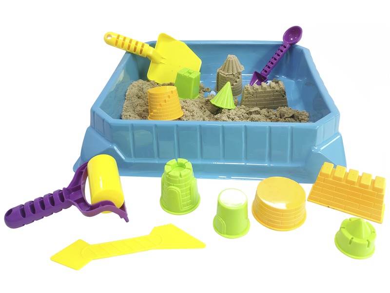 Készíts kinetikus homokból egy masszív lovagi várat! A Kastély homokgyurma készlet különleges homokot, valamint homokozó szerszámokat, nyomóformákat tartalmaz, amikből egy szép várat tudsz megformázni. A kinetikus homok soha sem szárad ki, könnyen formázható, a nyomóformákkal pillanatok alatt el tudod készíteni a bástyákat és a tornyokat is. A készlet egy ládát is tartalmaz, amibe be tudod szórni a homokot, így a játékot beltéren is használhatod.