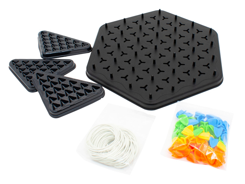 A Triggle egy gyors, taktikus logikai játék, ahol rugalmas gumikat feszítesz ki a hatszögletű táblán lévő pöckök között. Körönként egy gumit rakhatsz le: mindig egyenes vonalban pontosan négy pöcköt kell összekötnöd, és érintenie kell legalább egy korábban lerakott gumit. Célod, hogy a kifeszített gumik háromszögeket zárjanak körbe, ekkor leteszed a saját színű bábud a kialakult területre. Egy körben akár több bábut is lerakhatsz, ha több új háromszög jön létre. A gumiszabályok egyszerűek: lefedhetsz már meglévő gumit, ha legalább egy közös pöcköt érint, nem kötheted össze ugyanazt a négy pöcköt, amit már egy gumi összeköt, és egy gumi nem feszíthető több mint négy pöcökre. A játék akkor ér véget, ha nincs több szabad háromszög a táblán, vagy valaki letette az utolsó bábuját – győz az, akinek több háromszögben áll bábuja. Kétfős módban játékosonként 10 gumival játszotok, a parti akkor zárul, ha mindketten leraktátok az összes gumit, ilyenkor is a legtöbb megszerzett háromszög dönt.