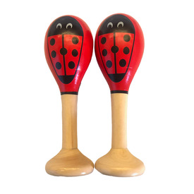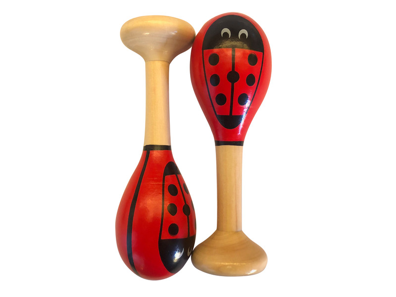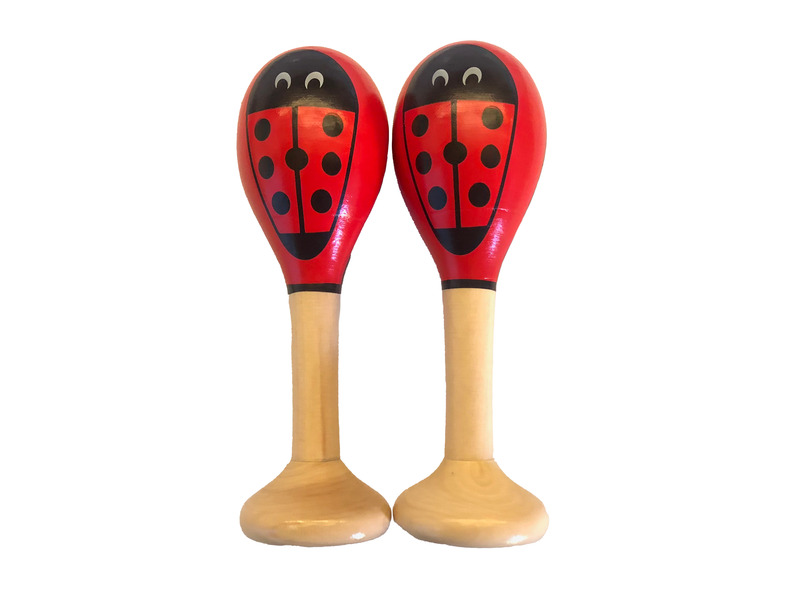 Fából készült csörgő (maracas), 15 cm-es méretben, katicás, vagy virágos mintával.