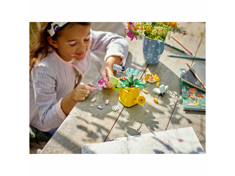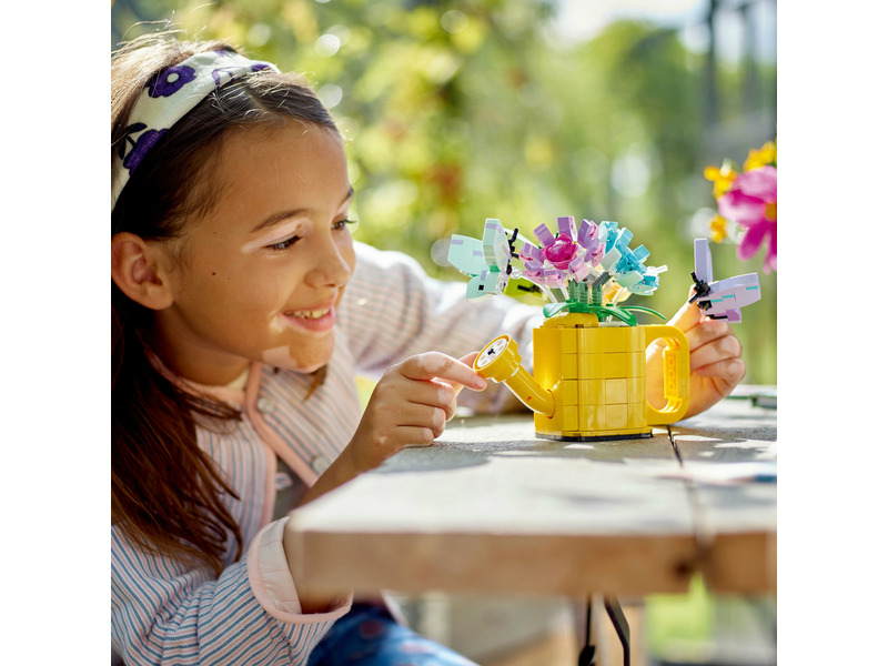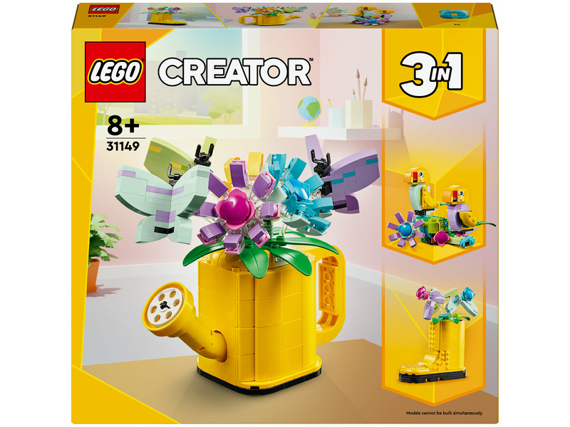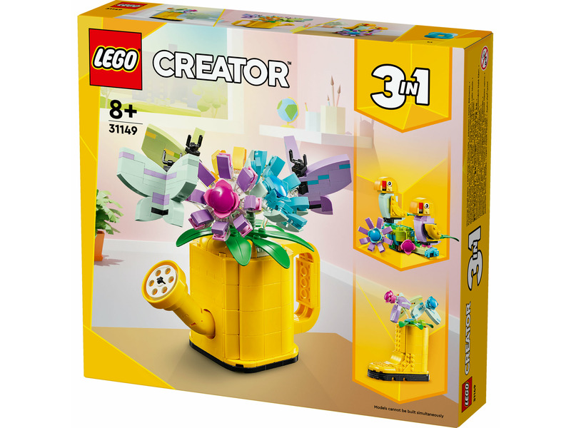 Építsd meg és építsd át a modelleket, majd játssz velük, és állítsd ki őket a természet ihlette LEGO® Creator 3 az 1-ben Virágok locsolókannában (31149) szettel. Tartalmaz egy kockákból épült, sárga játék locsolókannát, amelynek fogantyúja és rózsája van. 3 játék virág van benne, amelyek szirmai mozgathatók, valamint átlátszó pálcákon 3 pillangót is tartalmaz, amelyek úgy néznek ki, mintha repülnének. A 8 éves vagy nagyobb lányok és fiúk átépíthetik ezt a természet ihlette játékot egy sárga gumicsizmává, 3 mozgatható szárnyú virággal és 2 aranyos, sárga játék madárral, akik egy virágokkal borított rúdon ülnek, majd az egyes modelleket büszkén kiállíthatják a szobájukban. A LEGO® Creator 3 az 1-ben játékok remek kreatív ajándékok lehetnek, hiszen minden szettben 3 különböző modellopció közül választhatnak a gyerekek. A menő járgányoktól a csodálatos állatokon át a részletgazdag városi jelenetekig mindenki számára akad egy Creator készlet.