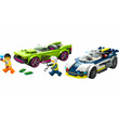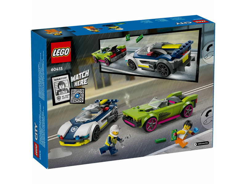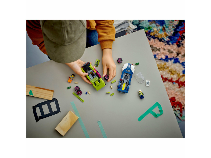 Szórakoztató LEGO® City autós játékkészlet 6 éven felülieknek, rendőri elfogó járművel és egy sportautóval, amelyekhez egy rendőrtiszt és egy szélhámos minifigura is tartozik a hősies üldözéshez.