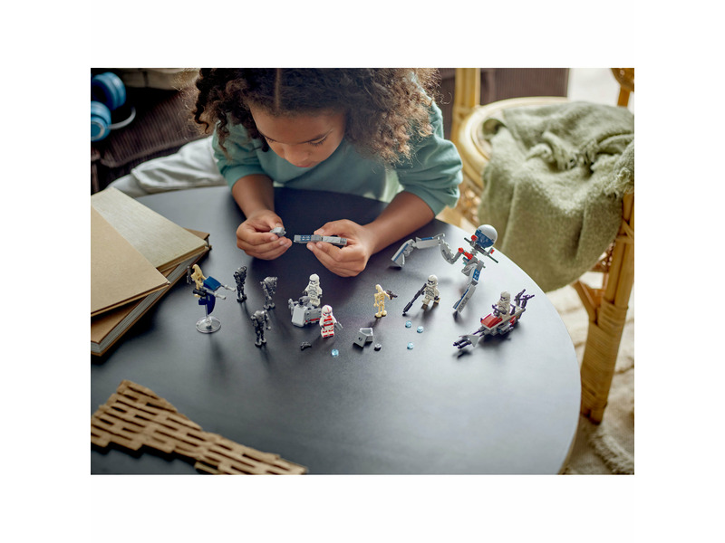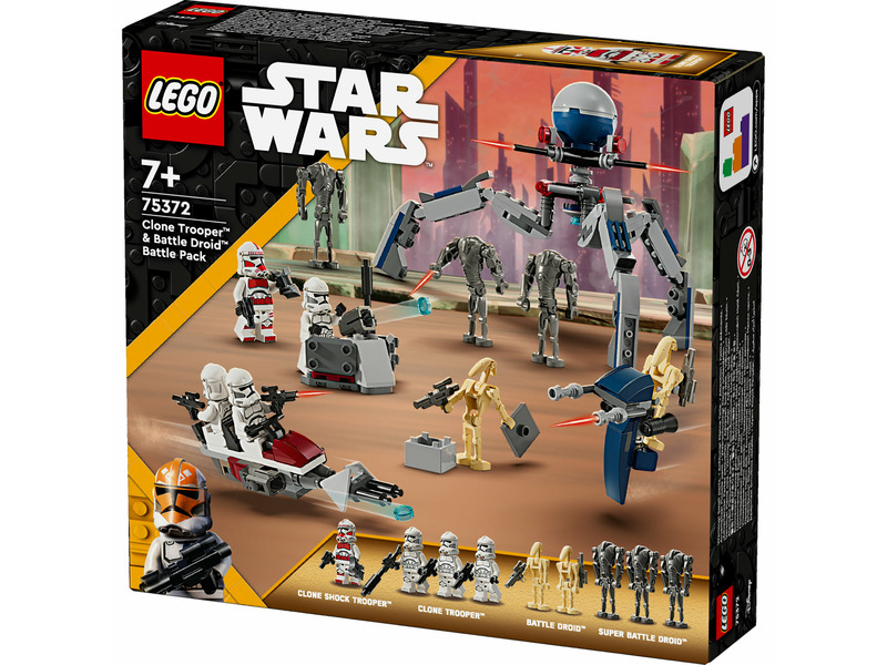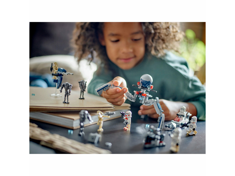Inspiráld a 7 éves vagy nagyobb ifjakat, hogy eljátsszák a Star Wars: A klónok háborúja izgalmas jelenteit ezzel a LEGO® Star Wars™ Klónkatona és harci droid harci csomaggal (75372). 4 LEGO Star Wars minifigurát és 5 LEGO figurát tartalmaz – Shock Trooper klónkatona, 3 klónkatona, 3 szuper harci droid és 2 harci droid – ikonikus fegyverekkel az akciódús játékhoz. A LEGO® építőszetthez tartozik egy koronglövő Star Wars speeder bike a 2 klónkatonának és egy megépíthető STAP speeder jármű a harci droidnak. A tri-droid a 3 pöccintős kilövővel és a védekezőállás a korongvetővel tovább fokozza a kreatív játéklehetőségeket. Nézd meg a LEGO Builder appot, ahol útmutatókat, valamint nagyító és forgató képmegjelenítő eszközöket találsz, amelyek felturbózzák a gyerek építési élményét! Ezzel a megépíthető játékkészlettel remekül lehet külön is játszani, de a szereplők és az építmények széles választékával, más LEGO® Star Wars szettekkel is kombinálhatók (ezek külön kaphatók).