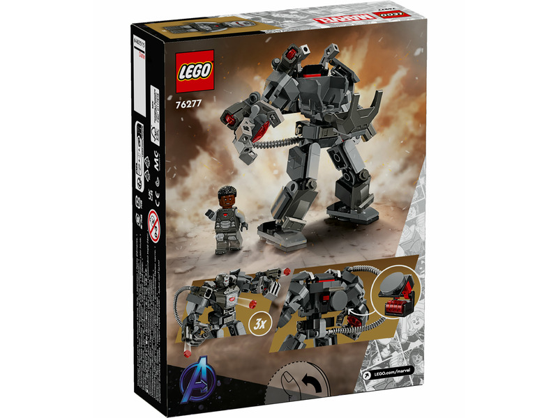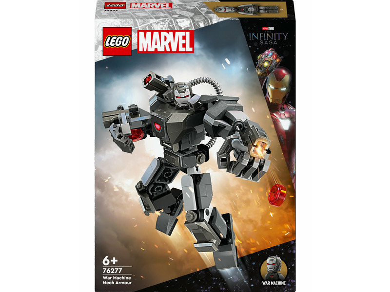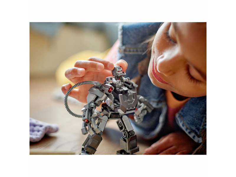 Megépíthető LEGO® Marvel Hadigép robotpáncél, csuklós felépítéssel a dinamikus akciókért, 3 korongvetővel, egy lőszertartó táskával és minifigura pilótával.