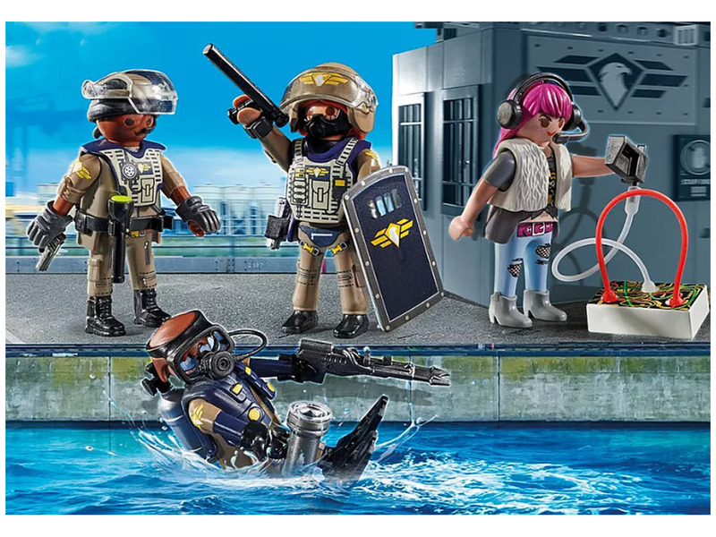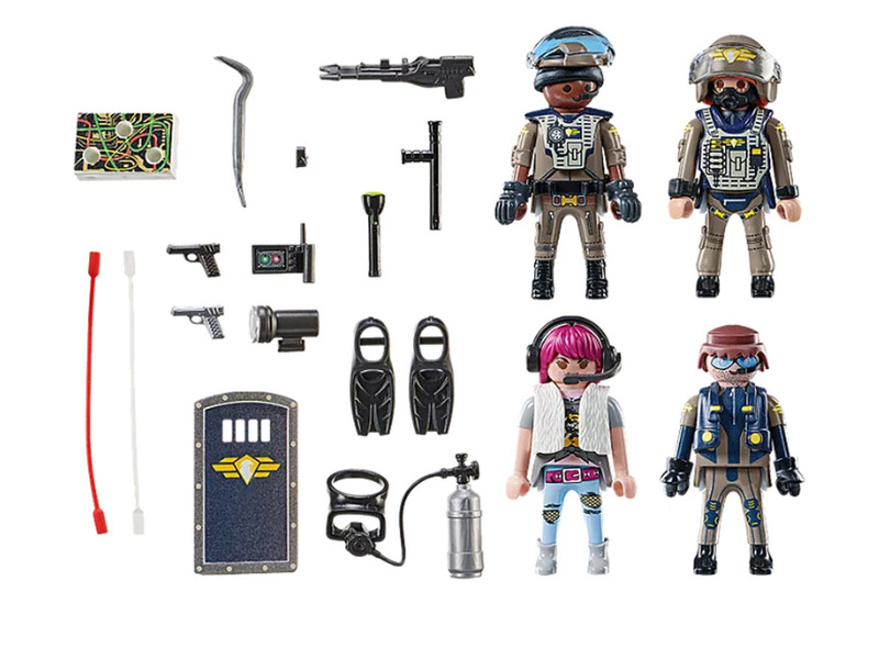 A szett tartalma: 2 db SWAT rendőr figura, 1 db SWAT rendőrnő figura, 1 db bűnöző figura, 2 db sisak, 1 db pajzs, 1 db búvárlámpa, 1 db szigony, 1 db zseblámpa, 1 db pisztoly, 1 db feszítővas, 1 db GPS készülék, 1 db headset, 1 pár békatalp, 1 db búvártartály, 1 db búvármellény, egyéb eszközök és kiegészítők.