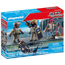 A Playmobil - City Action - SWAT - Figuraszett (71146) minden szükséges elemet tartalmaz, hogy a gyerekek saját gyorsreagálású csapatukat hozhassák létre. A szett része egy profi búvár, egy műveleti koordinátor és a munkacsoport tisztje, akik készen állnak, hogy a szökevények nyomába eredjenek. A levehető sisakok, headsetek, kesztyűk, békatalpak, búvártartályok és karmandzsetták, valamint a rögzíthető speciális felszerelések – mint a pisztoly, feszítővas és zseblámpa – mind hozzájárulnak a játék élethűségéhez és izgalmához.