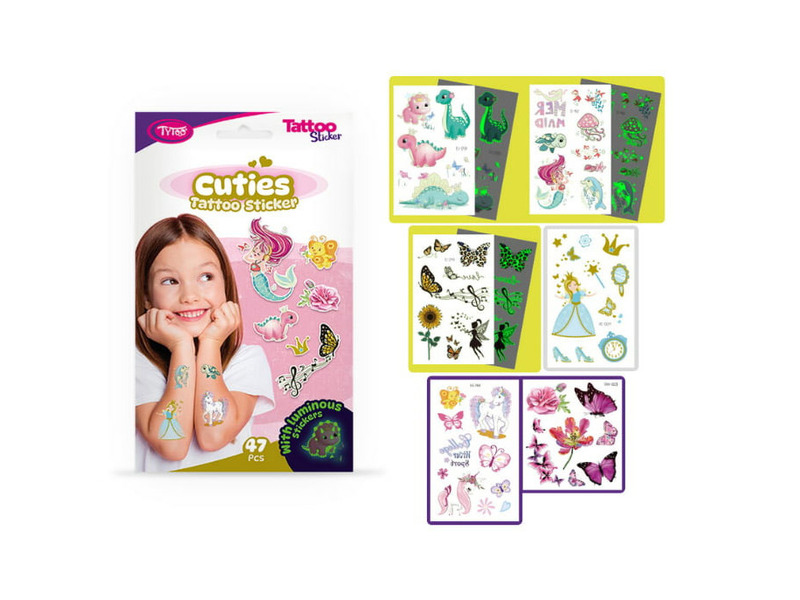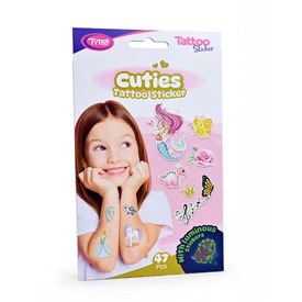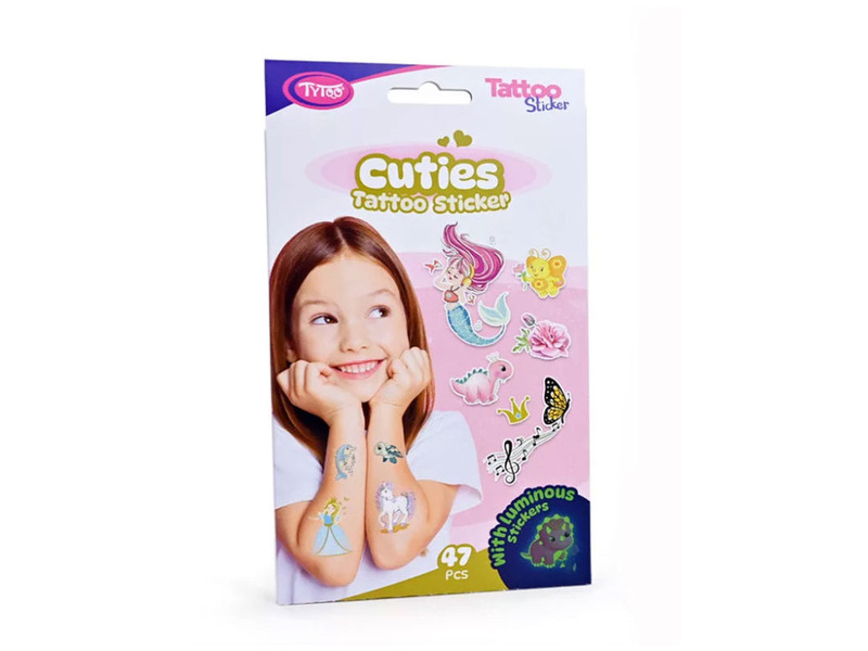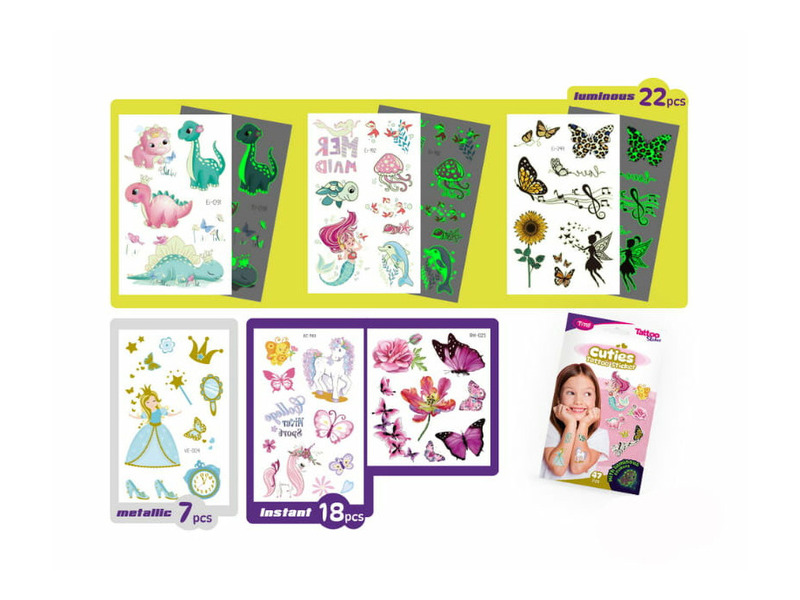 A Tytoo Cuties tetoválás matrica szett minden gyermek arcára mosolyt csal. A szettben található 47 db aranyos matrica tökéletes kiegészítője bármely gyermekzsúrnak vagy születésnapi bulinak. A hercegnőktől a delfineken át a tiarás dinoszauruszokig minden megtalálható, amit csak a gyerekek imádni fognak.