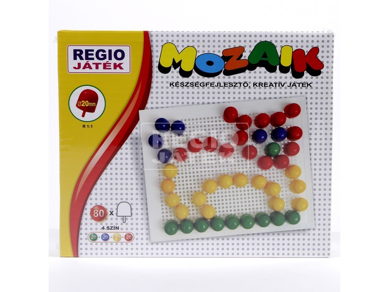 Csinálj tüskékkel színes, nagyobb képeket! A Mozaik képkirakó 80 darabos készlet egy lyukacsos táblát nagyobb, 2 cm-es átmérőjű tüskéket tartalmaz piros, sárga, zöld és kék színben. A tüskékkel állatos, autós képeket tudsz készíteni, minden színből 20 darabot találsz a csomagban. Engedd szabaddá a fantáziád, és rajzolj a műanyag tüskékkel! Csomagolás méretei: 28 x 8 x 23 cm.