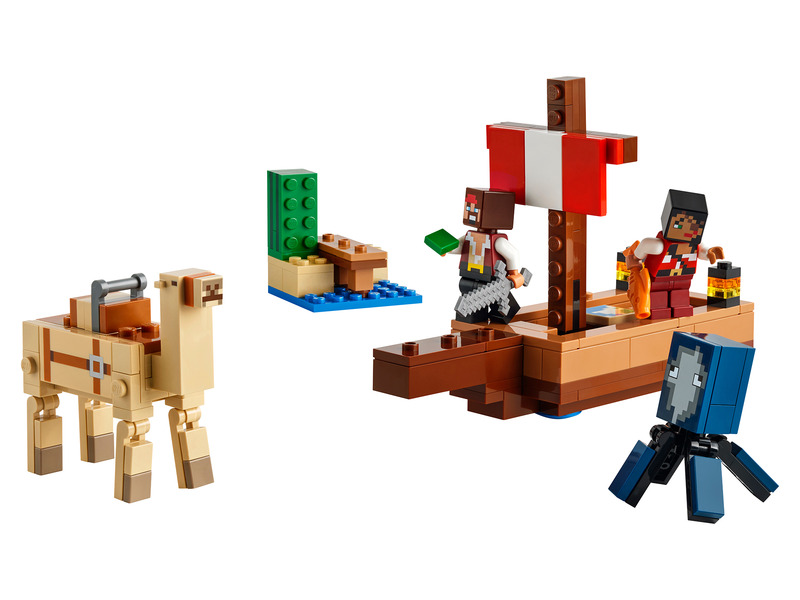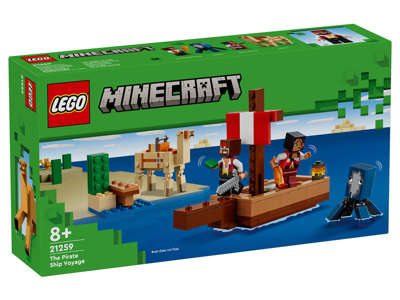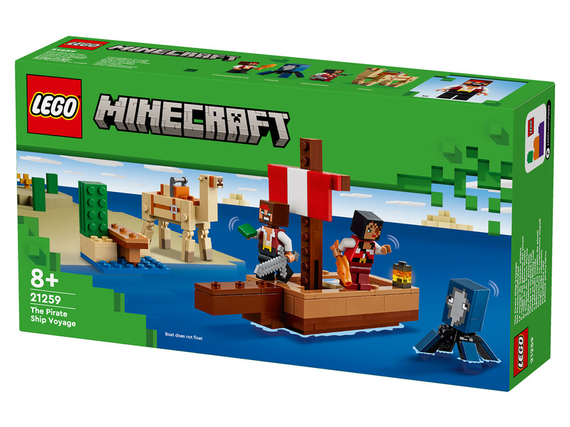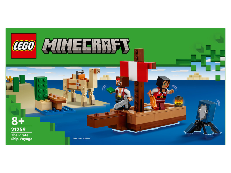 Ahoy! A LEGO® Minecraft® A kalózhajós kaland játék egy akciódús játékszett, amely 2 kalózt, egy megépíthető hajót, egy tintahalat és egy tevét rejt.