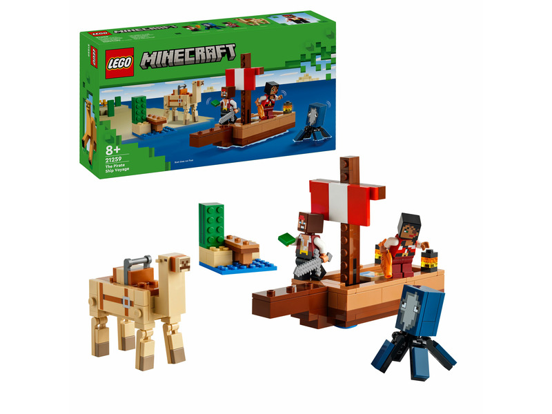 A kalózhajós kaland (21259) egy LEGO® Minecraft® kalózfigurát tartalmazó szett, amellyel külön játékként is lehet játszani, de kombinálhatod más (külön kapható) készletekkel is, hogy még intenzívebb legyen a játék! Ez a gyerekeknek készült kalózhajós játékszett egy sokoldalú és gyakorlatias, videójátékon alapuló ajándék lehel Minecraft-játékosoknak, és olyan 8+ éves fiúknak, lányoknak, akik szeretik a játék hajókat és a vidám építést. Ez a LEGO Minecraft kalózkalandok készlet tartalmaz egy megépíthető, játék járművet, valamint egy tintahal, egy teve és két kalóz figuráját, plusz kiegészítőket. A kalózokkal, a kalózhajóval és a felnőtt LEGO Minecraft tevefigura első megjelenésével ez a különleges LEGO szett le fogja nyűgözni a Minecraft rajongóit. A teve kétüléses nyergén mindkét kalóz számára van hely, hogy a következő kalandjukra indulhassanak. A kiegészítők, mint például a hal, a térkép, a vaskard és a kaktusz, segítik a fantáziadús játékot. A készlet könnyedén kombinálható más LEGO Minecraft szettekkel (külön kaphatók) a még több játéklehetőség érdekében!