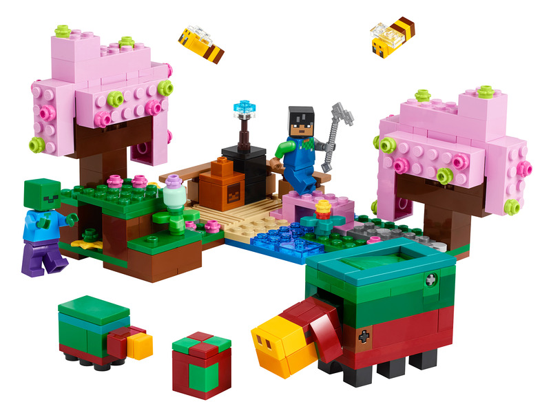 A készlet tartalmazza a szükséges LEGO elemeket, hogy a játékosok megalkothassák a cseresznyevirágos fákat, a virágokat és a többi növényt, valamint a Minecraft karaktereket, mint például a méheket és a bárányokat.