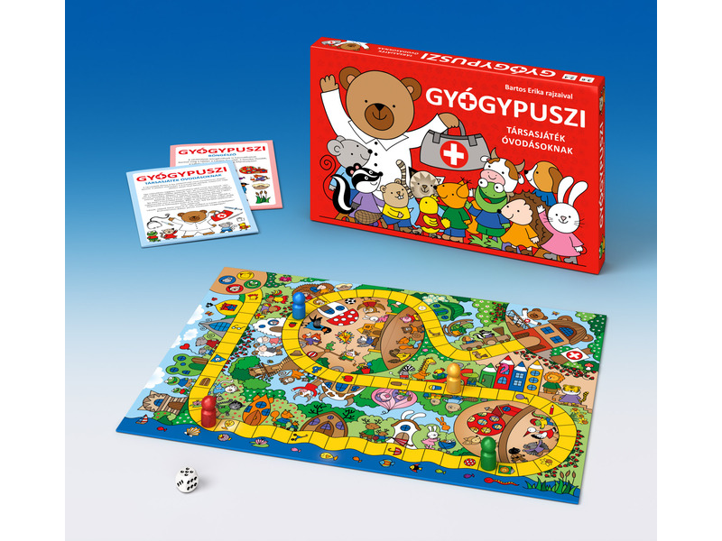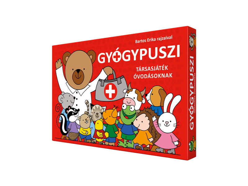 Fedezze fel a Gyógypuszi társasjátékot, ahol a kedvenc mesefigurák életre kelnek! Bartos Erika Gyógypuszi mesekönyveinek olvasói most játék formájában is találkozhatnak a szeretett karakterekkel. A játékban Brummbrumm doktor rendelőjébe érkező állatok – a cica, a béka, az egérke és a csibe – mind-mind megkapják a szükséges ellátást a gondos mackó doktortól. A Gyógypuszi játék nem csak szórakoztató, hanem oktató jellegű is, hiszen a gyermekbetegségeket bemutató mesekönyvek szellemében készült. A lépegetős társasjáték, amely az „Úton az oviba” klasszikus játékhoz hasonló, egy rendkívül látványos és részletgazdag játéktáblával büszkélkedhet. A játék során a gyerekek nem csak a figurák mozgatásával sajátíthatják el a sorrendiség és a számolás alapjait, hanem a böngésző/képkereső játékszabály révén fejleszthetik megfigyelőképességüket és kép-associációs készségüket is.