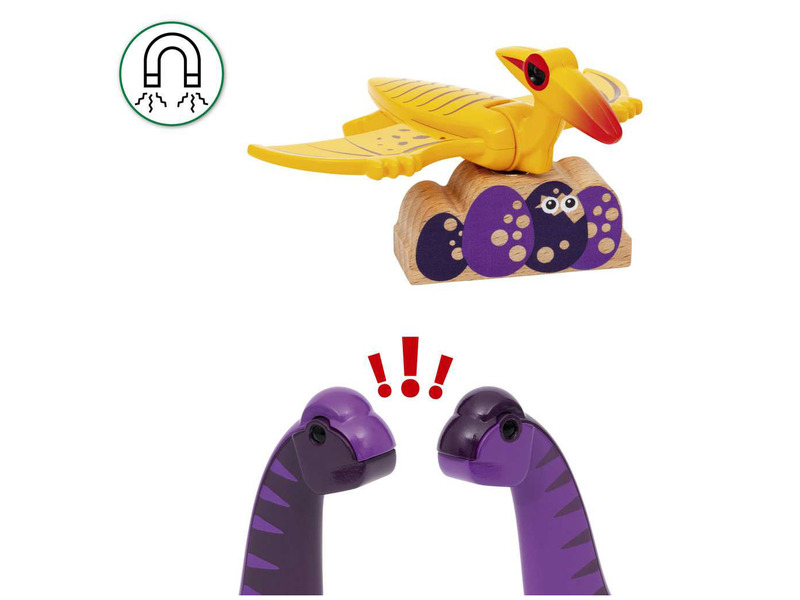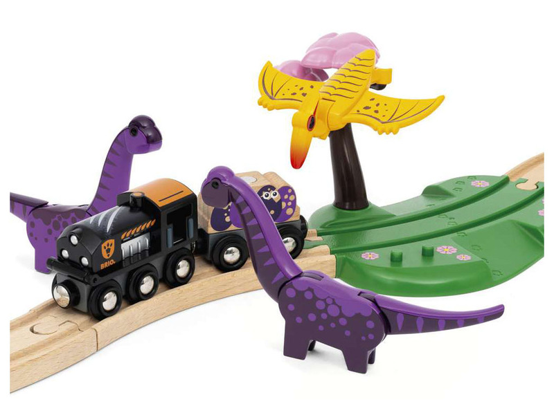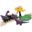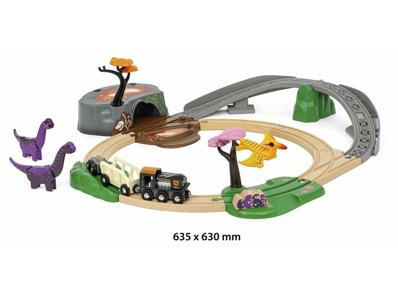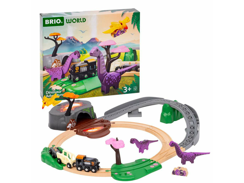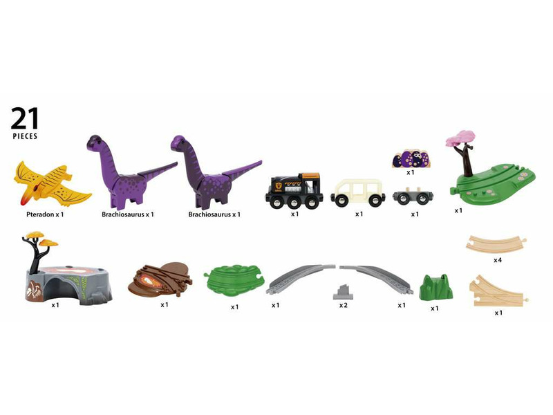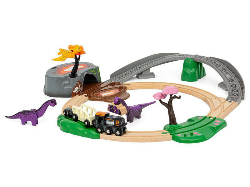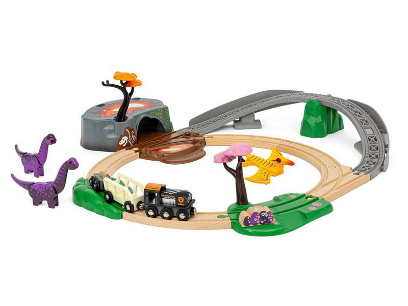 Ez a 21 részes dinoszaurusz témájú készlet rengeteg szórakozást kínál. Tartalmaz egy vonatot 2 vagonnal, festői elemeket, mint például egy veszélyes lávabarlangot és füves réten lévő síneket, valamint különböző játékszintekkel rendelkező vonatokat. A készlet három színes dinoszauruszt is tartalmaz, mindegyik egyedi mozgó alkatrészekkel és klasszikus BRIO mágnesekkel, amelyek lehetővé teszik számukra, hogy kölcsönhatásba lépjenek a környezetükkel.