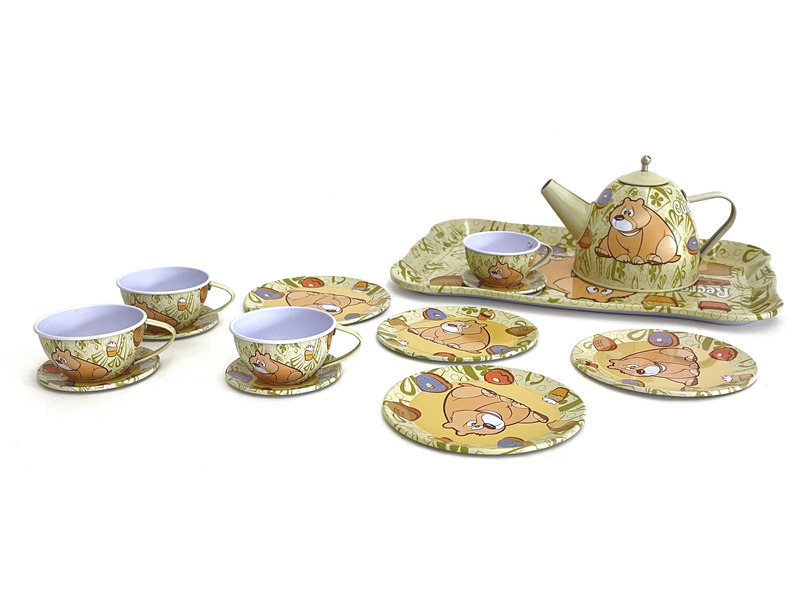 Készen állsz egy mesés teapartira? A 15 darabos fém teáskészlettel bárkiből lehet igazi kis házigazda! A szett mindent tartalmaz, amire csak szükséged lehet: egy teáskanna, csészék, csészealjak, kistányérok és egy szép tálca is vár rád.