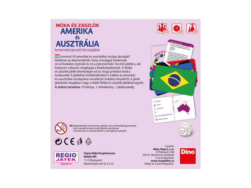 Ismered 50 amerikai és ausztráliai ország zászlaját? Mekkora az alapterületük, hány országgal határosak, mi a hivatalos nyelvük és mi a pénznemük? Az első játékos, aki helyesen válaszol, megkapja a feladványkártyát. A Móka és zászlók játék lehetőséget ad rá, hogy próbára tedd a tudásodat! A játékban kvízkérdéseket is találsz az amerikai és ausztráliai országokra vonatkozó érdekes tényekről. A játék játszható magában vagy a többi Móka és zászlók játékkal együtt.