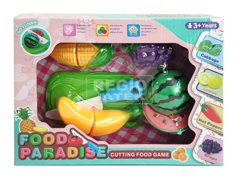 Szeleteld fel a gyümölcsöket műanyag késsel! A Műanyag vágható gyümölcs 10 darabos készletben egy dinnyét, banánt, egy cső kukoricát és egy fürt szőlőt találsz, amiket a vágódeszkán tudsz darabokra vágni. A gyümölcsök tépőzárral illeszthetők össze, a műanyag vágható gyümölcs 10 darabos készlet minden konyhai játékkészlettel együtt használható. A gyümölcsök színe eltérhet a képen láthatótól.