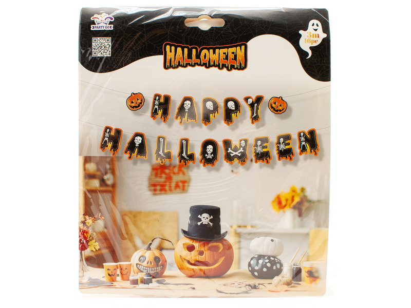 Készülj a legfélelmetesebb éjszakára ezzel a 3 méteres Halloween füzérrel! A Happy Halloween felirat és a klasszikus halloweeni motívumok garantálják az ünnepi hangulatot, legyen szó otthoni dekorációról vagy egy hátborzongató buliról.