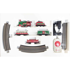 PIKO 57081 Kezdőkészlet, Karácsonyi gőzös személy- és tehervagonokkal, ágyazatos sínnel a mozdonyban nincs digitális előkészítés és menetfény egy személyvagon, egy zárt és egy nyitott teherkocsi pálya: ágyazatos oválpálya, 110 x 88 cm (Piko A sínszett, bővíthető) adapter + menetvezérlő