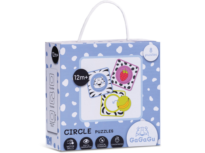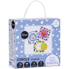 A GaGaGu egy a csecsemőkre gondolva létrehozott márka, multiszenzorikus játékok kollekciója, amelyek támogatják a fejlődést az élet első hónapjaiban, csak a szükséges ingereket szolgáltatva. Lehetővé teszi a gyermeknek a belépést a különböző textúrák, színek, hangok és motorikus kihívások világába. A fekete-fehér színvilág és a karakteres minták serkentik az apróságok látó érzékszervét, az erős színhangsúlyok pedig vonzó elemet jelentenek a valamivel idősebb gyermekek számára is, így a játék a gyermekkel együtt „nő”. Gagagu Bébi Puzzle – Körök olyan gyerekeknek készült, akik már elsajátították az alapvető kézi készségeket, és össze tudják egyeztetni az egyes elemeket. A készlet 8 db 2-6 részből álló rejtvényt tartalmaz, ami lehetővé teszi a nehézségi szint szisztematikus növelését a gyermek fejlődésének megfelelően. A különböző színek és formák megkönnyítik gyermeke számára a megfelelő puzzle alkatrészeinek megtalálását. A játék 12 hónapos kortól ajánlott, így kiváló választás ajándéknak.