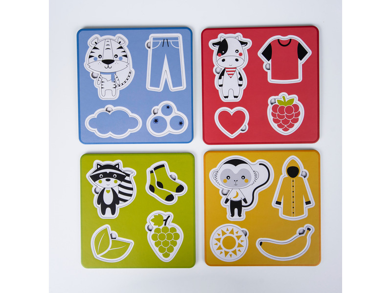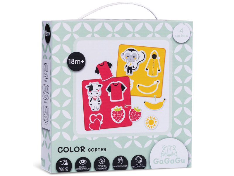 GaGaGu Színszortírozó egyedi oktató készlet, amely játékon keresztül támogatja a gyermek kognitív és motoros fejlődését. A készlet négy különböző színű táblából áll. A táblákon GaGaGu aranyos állatkáinak, különböző gyümölcsöknek és szimbólumoknak a rajzai vannak, ami segít a gyermeknek a színek, alakzatok és ok-okozati kapcsolatok felismerésében. A kis bemélyedéseknek köszönhetően könnyebb eltávolítani az egyes elemeket, így a játék élvezetessé és kielégítővé válik. A GaGaGu Színszortírozó nemcsak serkenti a gyermek látását kontrasztos színekkel és barátságos mintákkal, hanem támogatja a finom motoros készségeket (kéz és ujjmozgások) az elemek kezelésével. Az alakok illesztése segít a kéz-szem koordináció és a logikai gondolkodás fejlesztésében. Magas minőségű, biztonságos anyagokból készült, ezért tartós és biztonságos a legkisebbek számára. Könnyű és praktikus, így tökéletes választás sétákhoz, utazásokhoz vagy autóba való elvitelhez. A termék 18 hónapos kor feletti gyermekek számára ajánlott, így kiváló választás ajándéknak. A Színszortírozó a GaGaGu márkajelzés alatt kapható termékek sorozatának része, amely tartalmaz más játékokat is, mint például csörgők, érzékszervi könyvek, plüss függők, labda és érzékszervi kocka. A GaGaGu sorozat összes játékát össze lehet kötni egymással, így egységes készletet alkothatunk, amely támogatja a gyermek sokoldalú fejlődését.