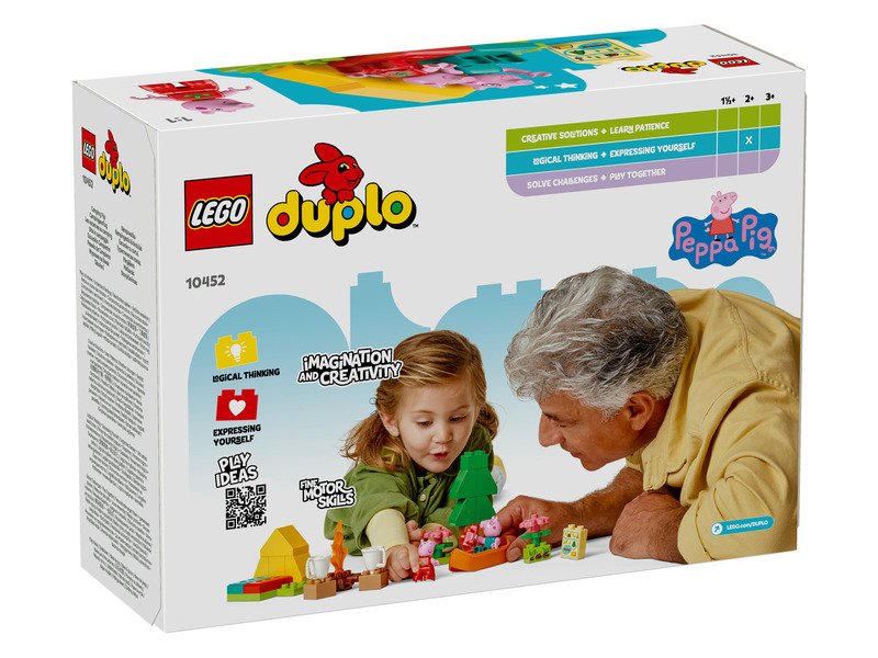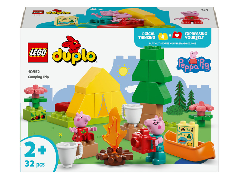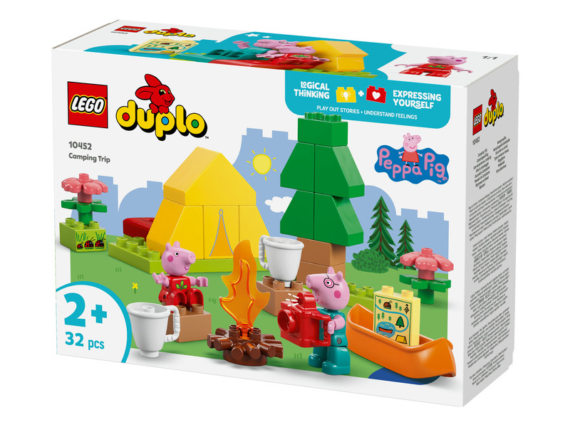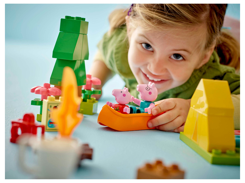 A kisgyermekek LEGO® DUPLO® Peppa malac kalandokra indulhatnak a Kempingezős kirándulás (10452) építőjátékszettel. Az óvodások a kreatív játékon keresztül fedezhetik fel, hogy miként élik meg első kempingezős élményeiket Peppa malac és Papa malac társaságában, majd eljátszhatják azt is, hogy felfedezik a folyót a játék kenuban.