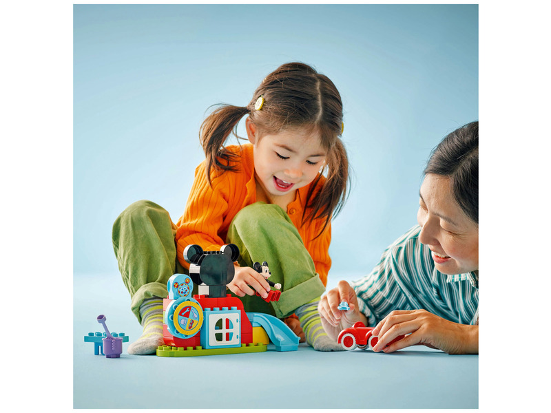 Ez a kisgyermekeknek készült, megépíthető válogatójáték segíti az óvodásokat a játékos tanulásban. A kicsik egy felnőttel felváltva pörgethetik a kereket, majd párosító készségük segítségével összepárosíthatják a képeket a színes kiegészítőkkel. Ebben a megépíthető, járműves játékkészletben olyan feladatok várnak rájuk, mint a megépíthető autó javítása a csavarkulccsal vagy az autómosás a vödörrel és a szivaccsal. Fejlődik az apró ujjacskák finommotoros készsége is, miközben felfedezik a lebilincselő részleteket, például a csuklópántos ablakot, a megépíthető, játék csúszdát és az autó forgó kerekeit. Ez a gyermekeknek szóló, izgalmakkal teli LEGO® DUPLO® építőjáték arra bátorítja a kisgyermekeket, hogy használják a képzelőerejüket és az önkifejezésük erejét, hogy saját, kreatív kalandokat találjanak ki Mickey egér játszóterén.