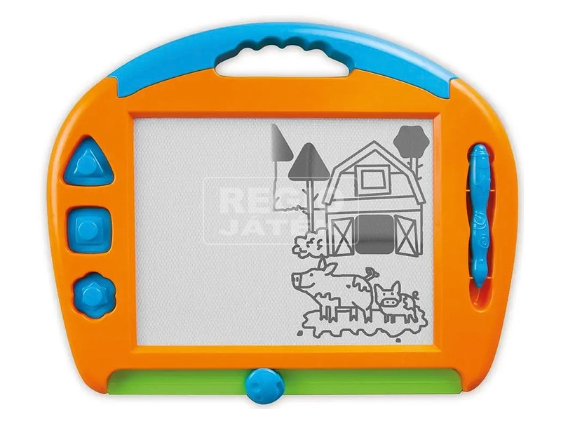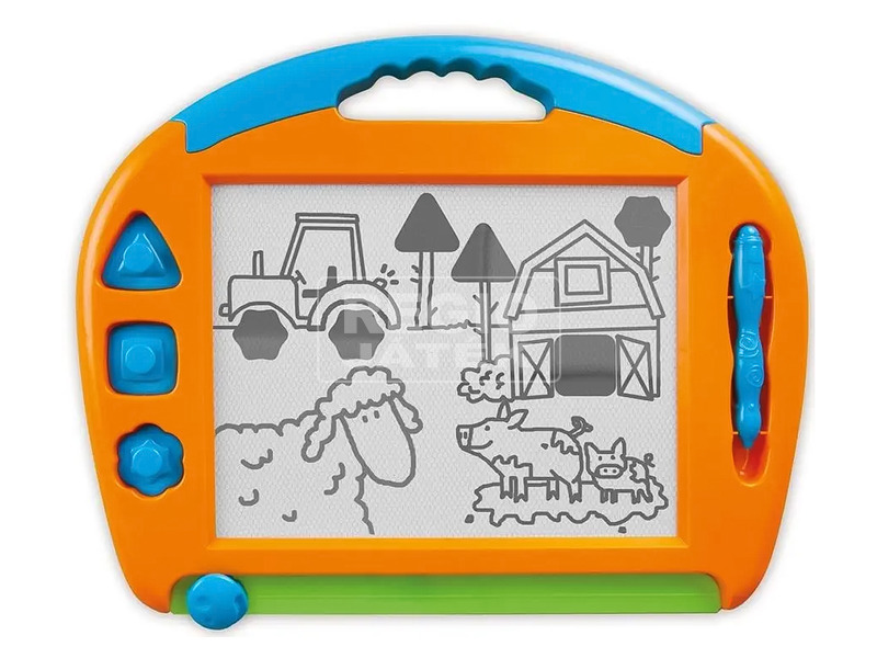 Rajzolj, alkoss a mágneses rajztáblán! A tábla kerete műanyag, a rajzolófelületre egy különleges tollal tudsz rajzolni, vagy a táblához tartozó különböző bélyegzőkkel díszítheted a rajzfelületet. Ha új rajzot szeretnél, csak húzd el a csúszkán a gombot, és a tábla újra üres lesz, így számtalanszor alkothatsz rá csodásabbnál csodásabb műveket. Hogyan lehetséges ez? A tábla alatt vaspor található, amit a mágneses toll magához vonz, így azonnal kirajzolódik a sok fantáziadús alkotás. A tábla méretei: 41x31x3 cm