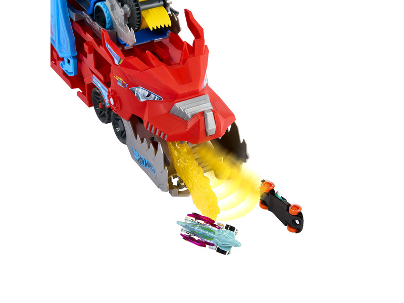 A tűzokádó szállító versenypályává alakítható, ahonnan az őrületes kalandok indulhatnak. A kisebb sárkány szárnyait kinyitva fentről cserkészheti be prédáit, és ha lecsap rájuk, fel is falhatja őket. A pálya összeköthető más (külön kapható) Hot Wheels készletekkel, ahol a kisautós kalandok folytatódhatnak. A készlet tartalmazza a két autószállítót és két 1:64 méretarányú járművet, további kisautók külön kaphatók.