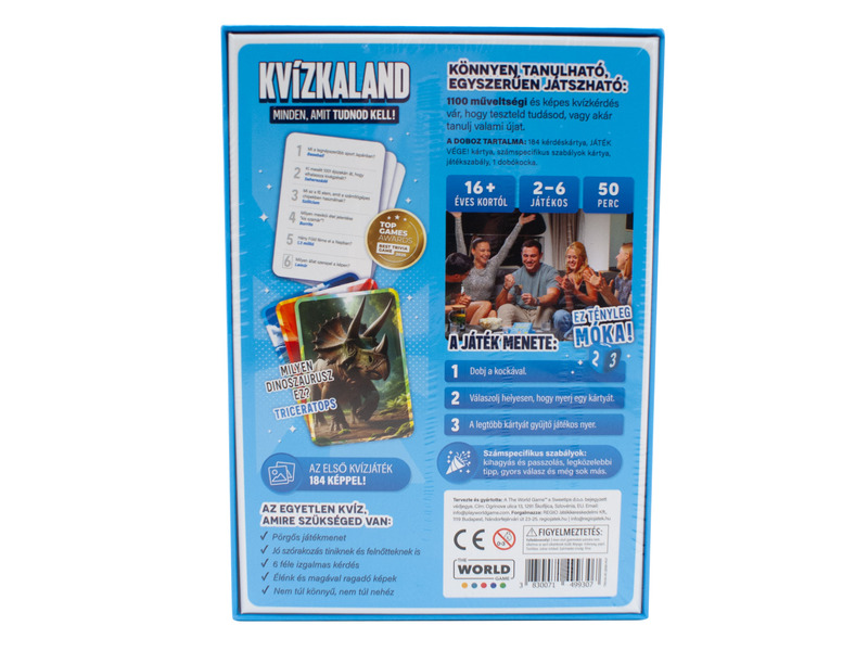 A Kvízkaland társasjáték egy pörgős, változatos tudáspróba, ahol a játékosok különböző témakörökből érkező kérdésekre válaszolnak, és a jó válaszokkal előre haladnak. Könnyen tanulható, mégis kell hozzá gyors észjárás és biztos általános műveltség — ezért baráti estére és családi kvízcsatára is remek választás. A doboz alapján összesen 1100 kérdés vár, így sokáig friss marad a játékélmény.