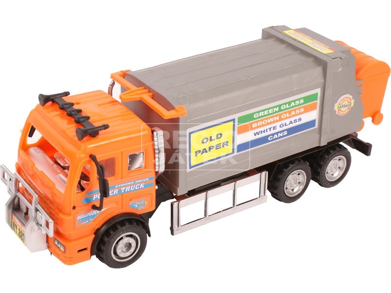 Gyűjtsd szelektíven a szemetet a lendkerekes kukásautóval! A műanyagból készült narancssárga kukásautó levehető kukájába be tudod gyűjteni a hulladékot, az emelőszerkezettel pedig a tartályba tudod juttatni. Az autó lendkerekes meghajtású, ha megtolod, némi lendülettel tovább fog gurulni. Méretek: 27 x 10 x 8 cm.