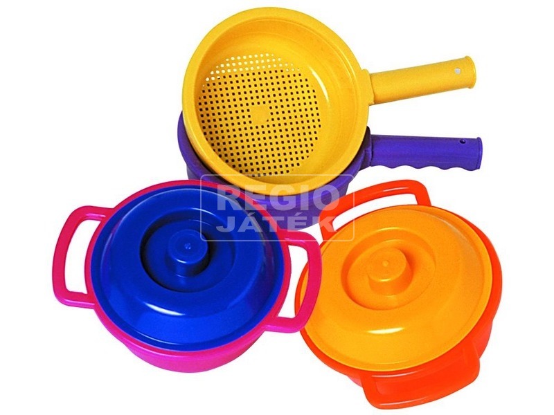 8 darabos konyhai játék készlet, eszközökkel, 12 cm-es edénykkel. A konyhai főzőszett lábas, serpenyő, fedő találhatóak. Erőteljes, feltűnő színvilágával magára vonja a gyermekek figyelmét. A készletnek köszönhetően a kicsik is igazi szakácsnak érezhetik magukat. Vonjuk be őket is a világába, engedjük a konyhába csemetéinket, készítsük együtt az ebédet, örömmel segítenek majd!