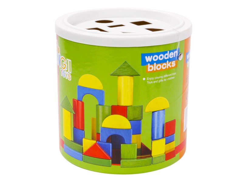 Építs várakat színes fa építőkockákból! Az Építőkocka formaválogató hengerben 45 darabos készlet változatos színű és méretű építőkockát rejt magában, amikből épületeket, járgányokat tudsz összeállítani. A játék különlegessége, hogy a tároló vödör tetején formaválogató rostát találsz, így az elpakolás is fejleszti a kézügyességedet! Az Építőkocka formaválogató hengerben 45 darabos készlet csomagolási méretei: 18 x 18 cm.