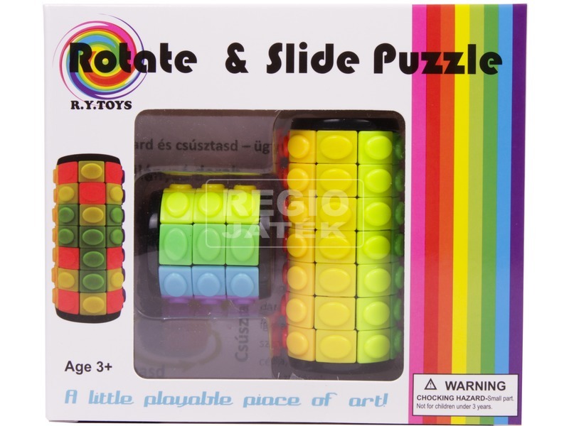 Tekerd és told a sorokat, hogy minden oszlopban ugyanolyan színű négyzetek legyenek! A Csavard és csúsztasd ügyességi játék egy logikát mozgató két darabos játék, ahol az összpontosításé a főszerep. A henger csavarható, és a hiányzó darabnál fel-le tudod mozgatni a torony négyzeteit. A feladat az, hogy minden oszlopban egyforma színű négyzetek legyenek.