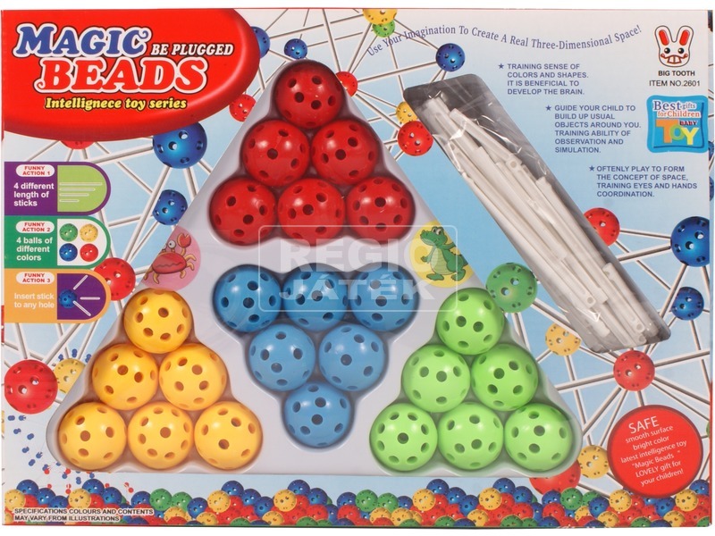 Érdekes építőjáték, amiből szokatlan formákat rakhatsz össze! A Magic Beads golyós építőjáték különlegessége, hogy lyukacsos golyókból és pálcikákból áll. Szokatlan térbeli elemeket, épületeket, kis gyakorlással óriáskereket vagy szélmalmot is tudsz építeni a műanyag elemekből. A készlet 24 színes lyukacsos golyót, többfajta hosszúságú műanyag pálcikát tartalmaz. Használd a fantáziád és alkoss változatos építményeket a Magic Beads golyós építőjátékkal! Csomagolás méretei: 31 x 23 x 4 cm.