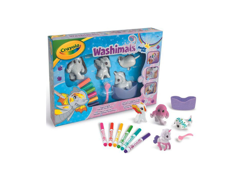 Ki mondta, hogy csak a lovak válhatnak szivárványszínben pompázó egyszarvúvá? A Crayola Washimals állatkornis játékszettben 4 figura, Una, Neddie, Naomi és Dex várja, hogy a gyerekek új színt adjanak kültakarójuknak. A kicsik szabadon színezhetik, firkálhatják és dekorálhatják a figurákat a csomagban rejlő 6 különböző színű filctollal. Ha elkészült az alkotás, elég csak lemosni az imádnivaló varázslényeket a készletben található kádban, és kezdődhet is elölről a móka! Még szappanra sincs szükség, elég lesz a víz és a dobozban található kis kefe. A játék fejleszti a gyerekek kreativitását, képzeletét, finommotorikáját, valamint lehetőséget teremt különböző történetek eljátszására, amely során a kicsik kommunikációs készsége is fejlődik.